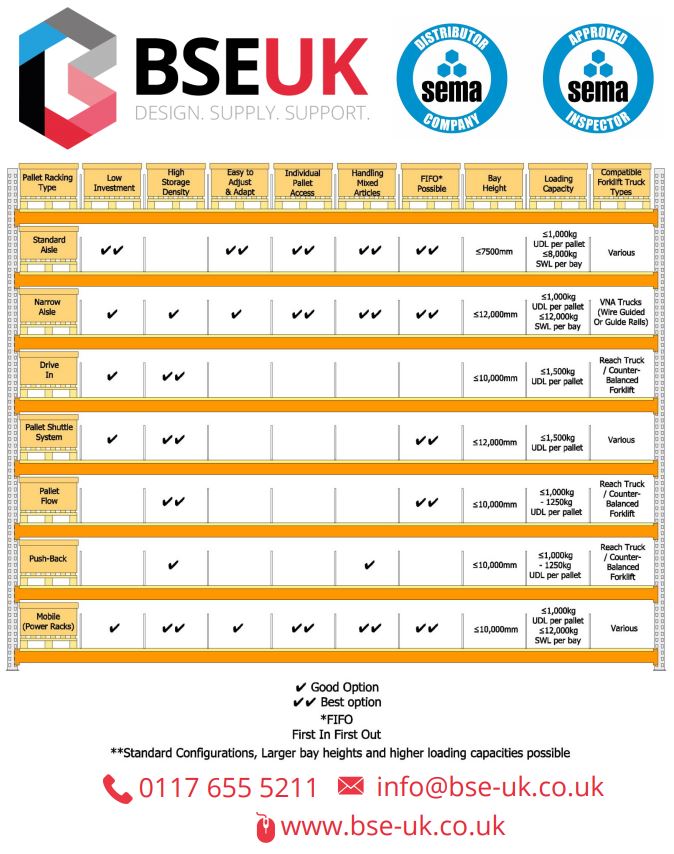 Our FREE chart helps you understand the key benefits of different racking systems and will guide you on the best choice for your requirements.
